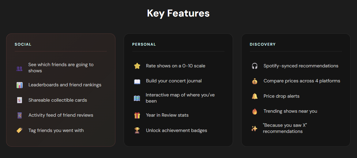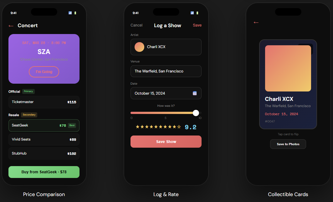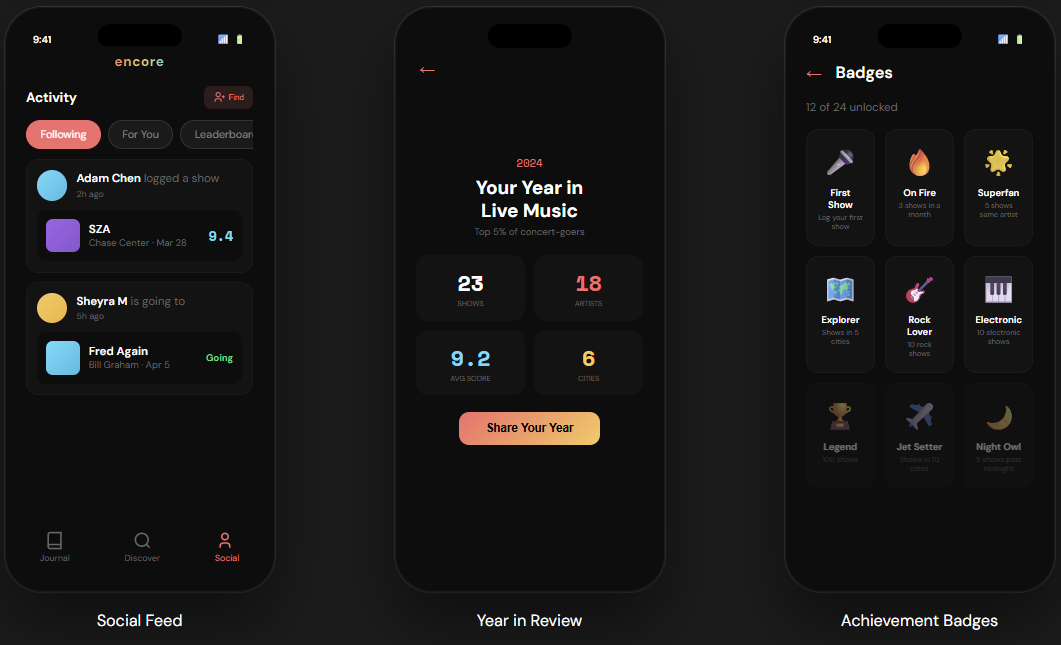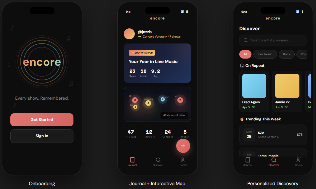 I've attended 50+ shows, seeing well over 150+ artists, and yet, I find myself tracking my experiences in my Notes app of all things. Encore is what I wish I had - the social journal app designed to capture and share the magic in each show, with built in personalization, concert recommendations, and price alerts. I built a functional prototype using Claude, try it here: https://encoresocial.vercel.app/
