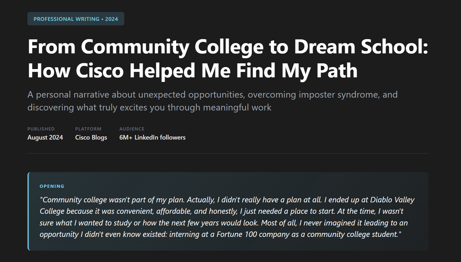 Looking back, I can see just how far this experience has taken me. I’ve graduated from community college, returned to Cisco for my second summer, and have been accepted to my dream school, UC Berkeley’s Haas School of Business. It feels surreal.